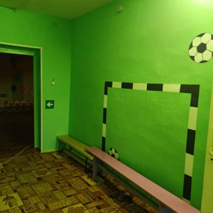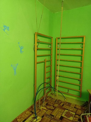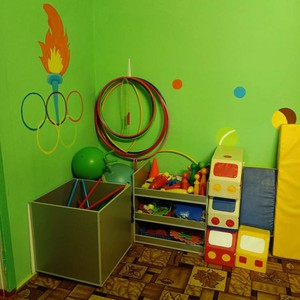 В Учреждении для занятий спортом имеется приспособленный спортивный зал - 17.7 кв.м., оснащенный игровым и спортивным оборудованием в соответствии с требованиями СанПиН, ФГОС ДО. (оборудован атрибутами и оборудованием для спортивных и подвижных игр, имеется шведская стенка, маты, гимнастические палки) — всё оборудование укреплено и безопасно.